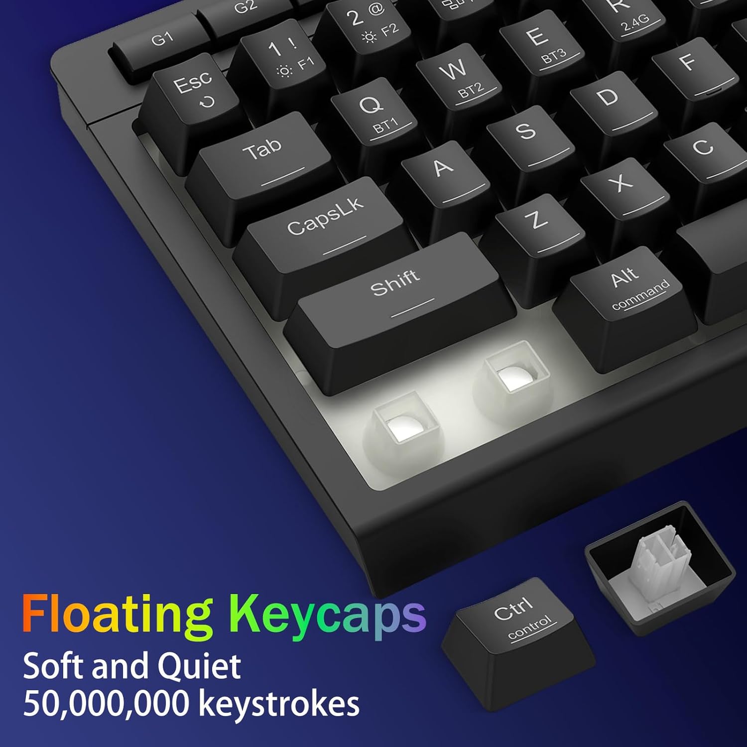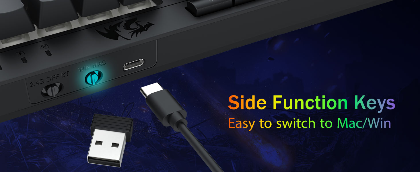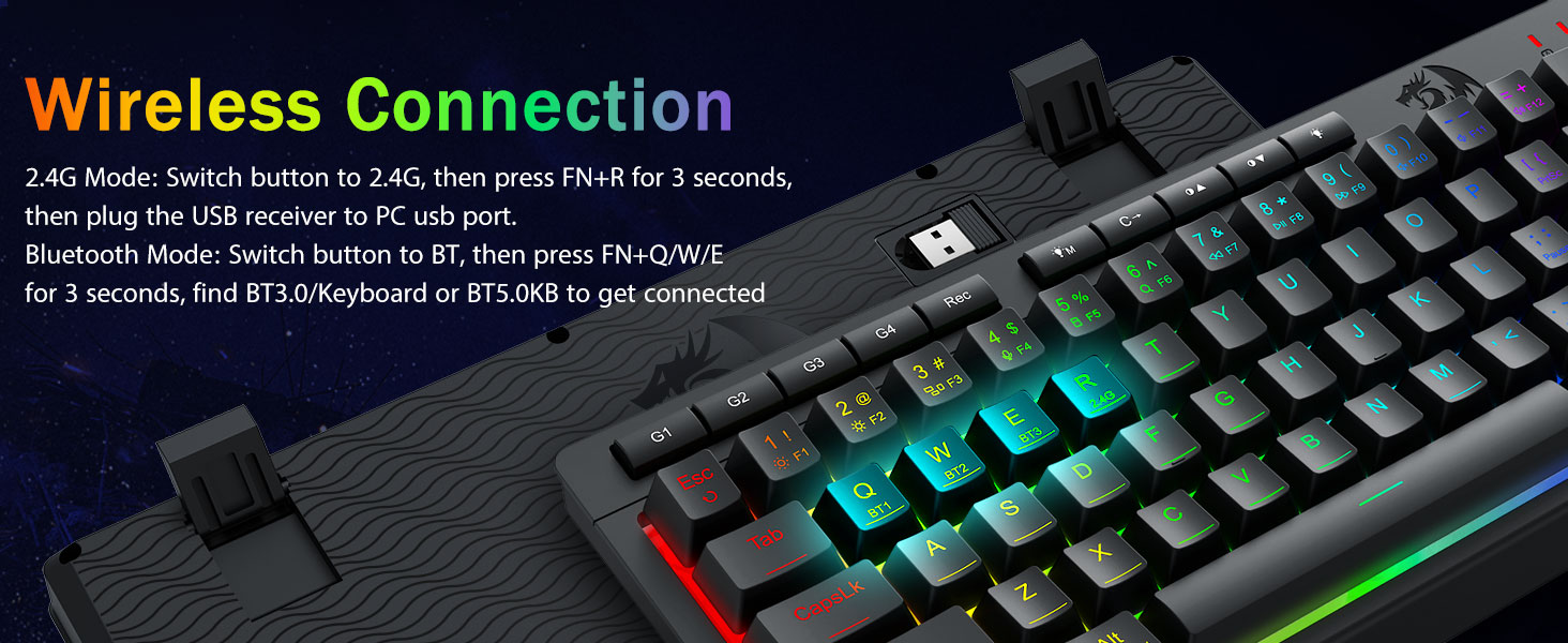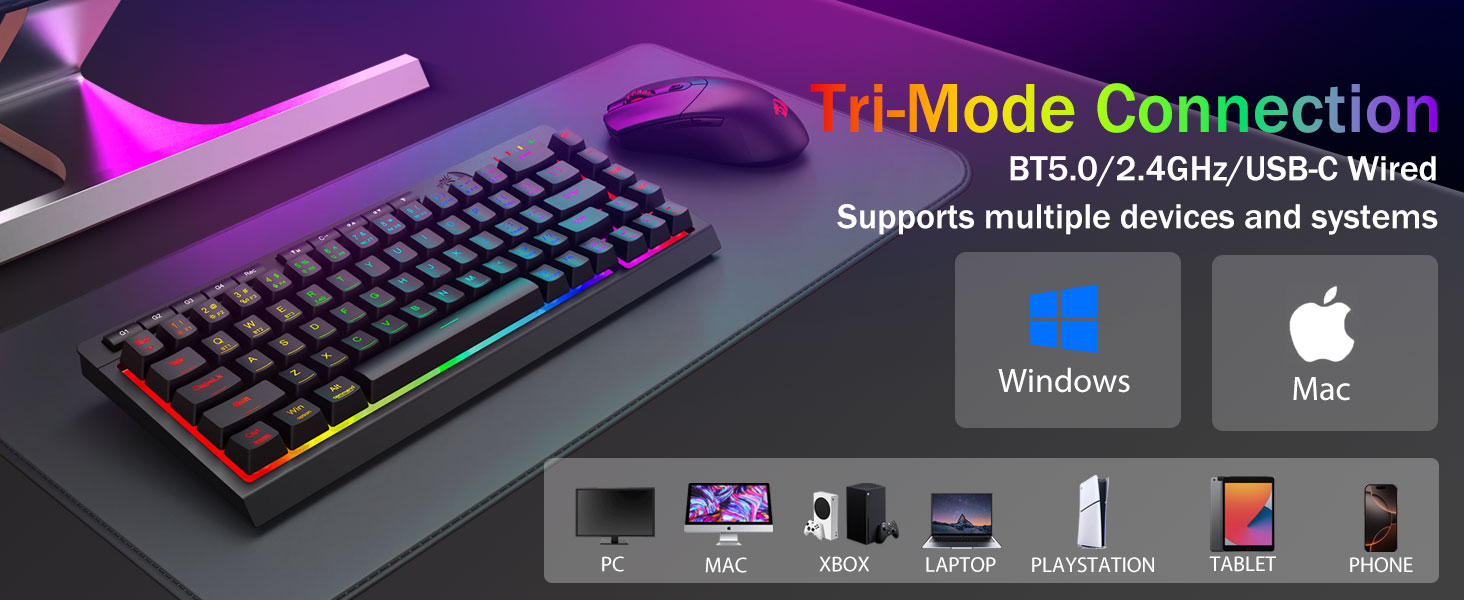 Tri-Mode მრავალმხრივობა და მრავალმოწყობილობის ოსტატობა -შეუფერხებლად გადართეთ Bluetooth 5.0, 2.4 GHz უსადენო ან USB-C სადენიანი რეჟიმებს შორის, 5-მდე მოწყობილობის ერთდროულად დაკავშირება (PC, Mac, ტაბლეტები, ტელეფონები, PS/XBOX). უპრობლემოდ გადართეთ მოწყობილობები მალსახმობის ღილაკების ან გვერდითი ღილაკის მეშვეობით - იდეალურია ჰიბრიდული სამუშაო/თამაშის დაყენებისთვის. იკვებეთ კვირების განმავლობაში 4000 mAh ბატარეით (30+ დღე ლოდინის რეჟიმში, 50 სთ RGB მუშაობის დრო).