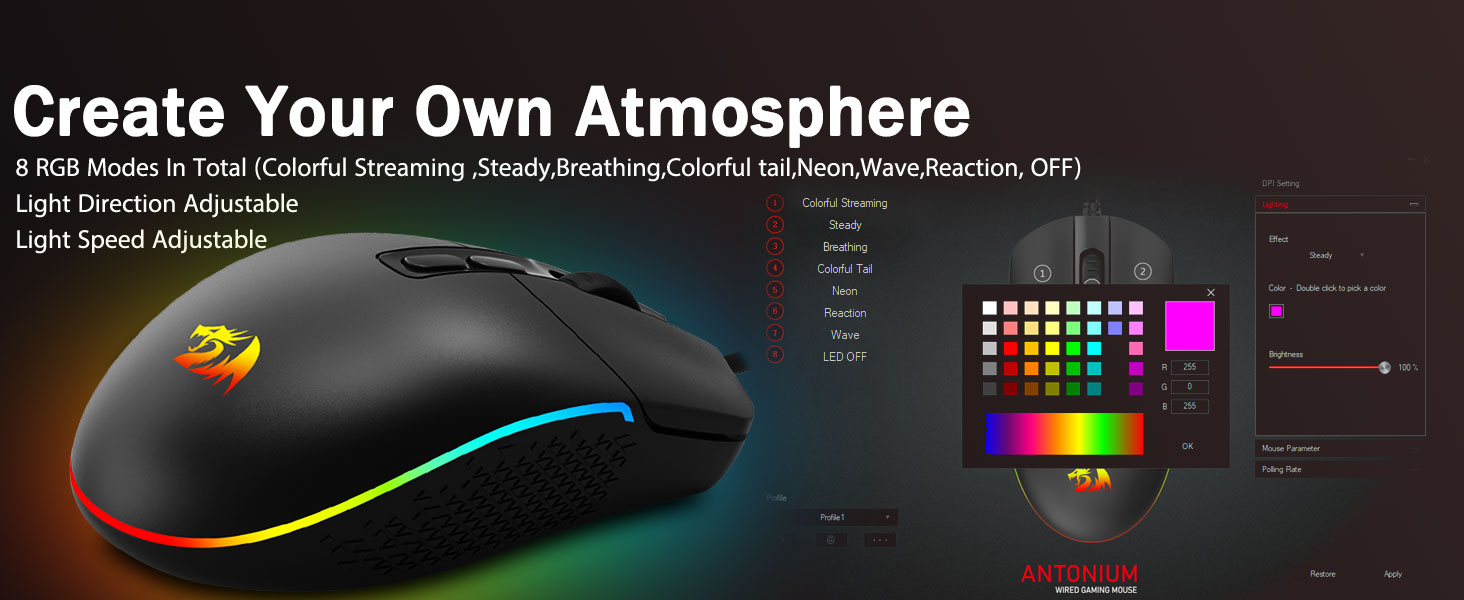 8 ღირსეული RGB განათების რეჟიმი- ჩართეთ განათება და გააკეთეთ რამდენიმე მკვლელობა თქვენს სათამაშო ბრძოლის ველზე. გაჟღენთილი დინამიური RGB განათებული ატმოსფერო არასოდეს მოგაბეზრებთ თქვენი სათამაშო სივრცის გაფორმებისას, უკეთესი იქნება Redragon-ის სხვა აქსესუარებით ჩართული განათებით.