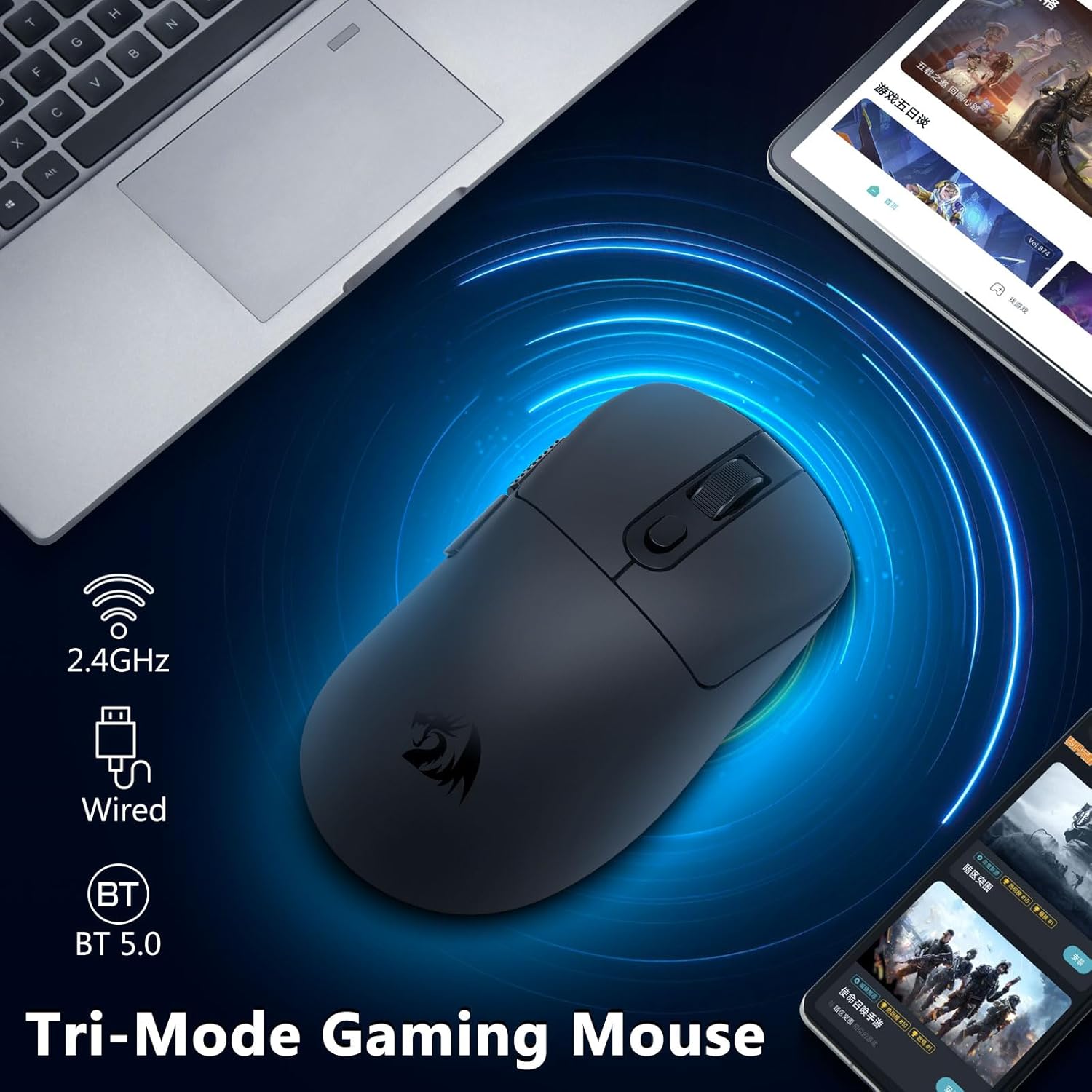CHUANGQUAN Black M818 უსადენო 24,000 DPI, Tri-Mode 2.4G სათამაშო მაუსი უზრუნველყოფს ზუსტ თვალყურის დევნებას, მოქნილ დაკავშირებას და გლუვ კონტროლს, იდეალურია მოთამაშეებისთვის და პროფესიონალებისთვის, რომლებიც ეძებენ სიჩქარეს, სიზუსტეს და მრავალ მოწყობილობაზე უწყვეტ მუშაობას.