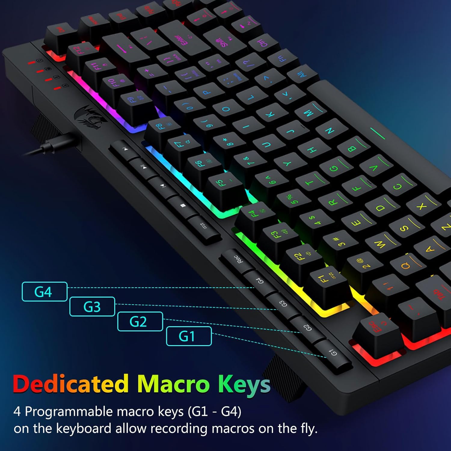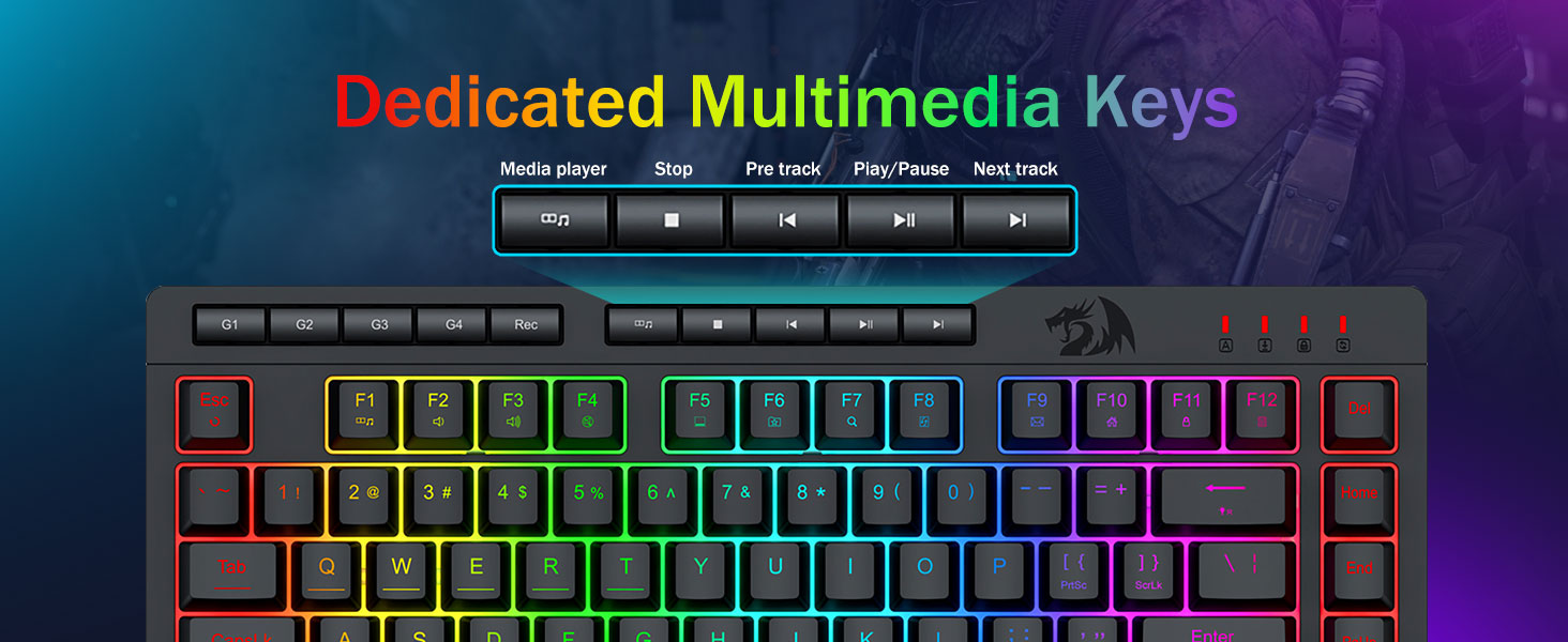 ეს სათამაშო კლავიატურა და მაუსი აღჭურვილია 4 ბორტ მაკრო ღილაკით, 5 დამოუკიდებელი მულტიმედიური კლავიშებით და 12 FN მულტიმედიური ფუნქციური კლავიშებით, მარტივი და მოსახერხებელი ფუნქციონირებისთვის. ეს არა მხოლოდ აუმჯობესებს ეფექტურობას, არამედ ხდის თქვენს სათამაშო პროცესს უფრო კომფორტულს და სწრაფს