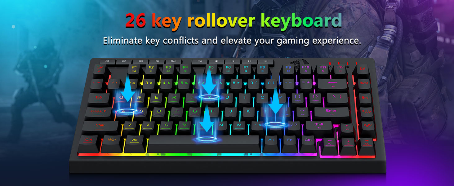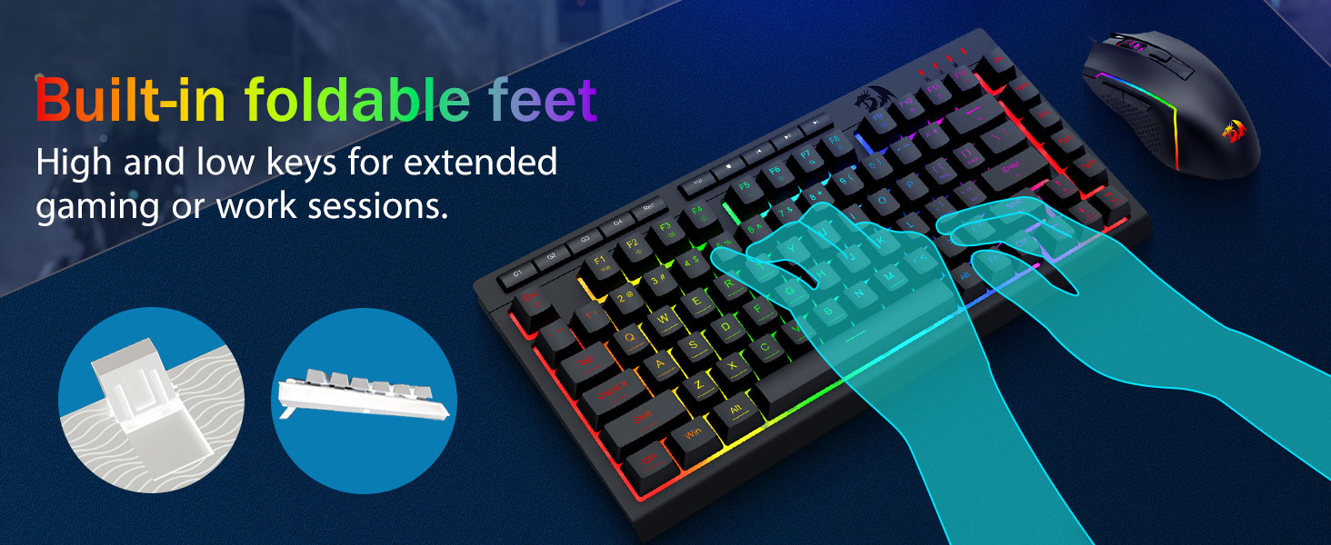 【კომფორტული თამაში】კლავიატურის დასაკეცი სადგამი, კანზე მორგებული საფარი და მცურავი კლავიშები ზრდის აკრეფის კომფორტს. 26 კლავიშების საწინააღმდეგო მოჩვენება უზრუნველყოფს ყველა ღილაკის ამოქმედებას. WIN გასაღები შეიძლება გამორთოთ თამაშისთვის. ეს კლავიატურა და მაუსი ეძღვნება ეფექტური სათამაშო გამოცდილების უზრუნველყოფას მაქსიმალური კომფორტის უზრუნველსაყოფად