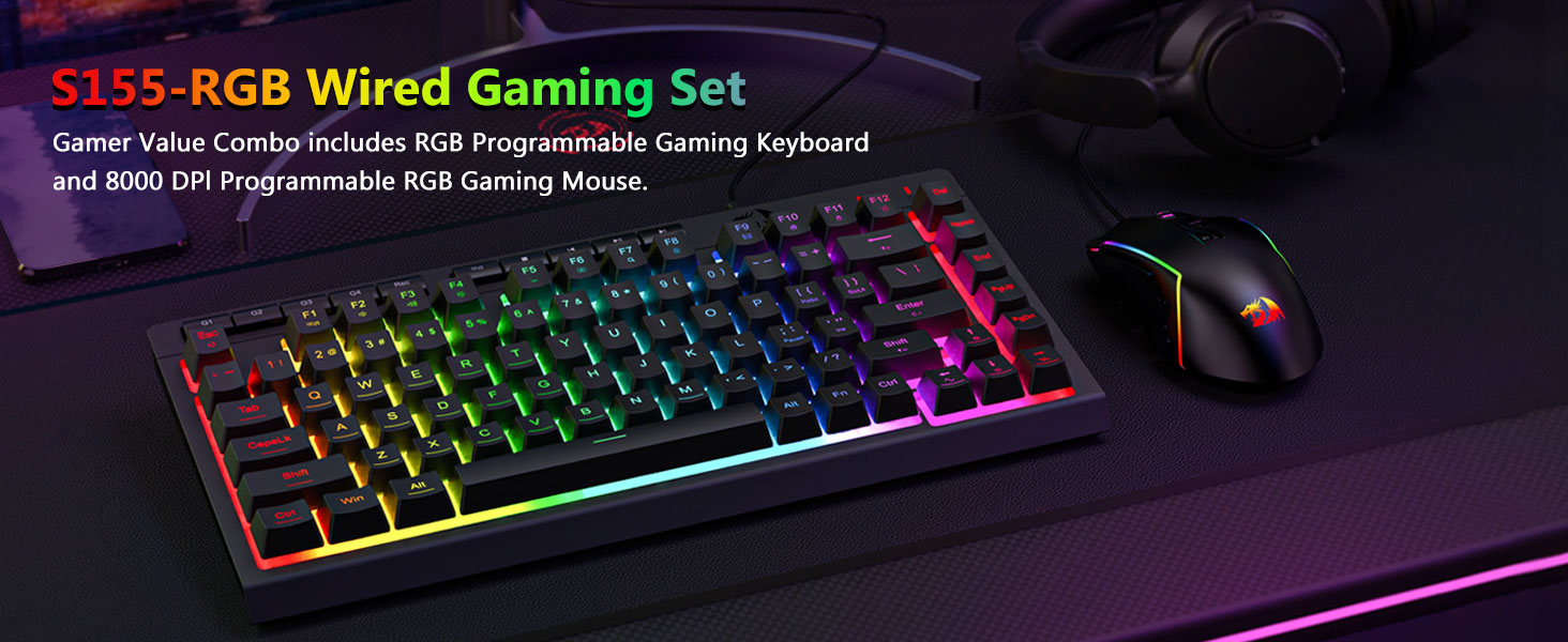 შავი S155 RGB განათებული სადენიანი სათამაშო კლავიატურა და მაუსი კომბინირებული