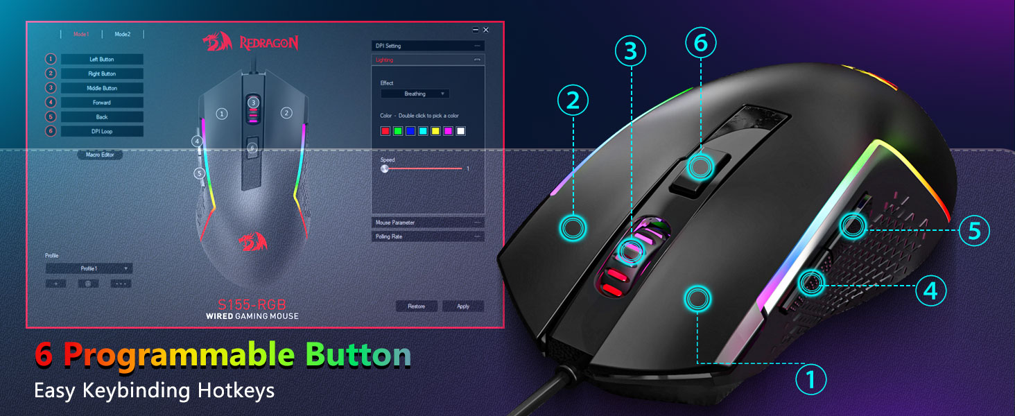 【პროფესიონალური სათამაშო მაუსი】თქვენ შეგიძლიათ დაარეგულიროთ DPI 1200-დან 8000-მდე DPI ღილაკის საშუალებით ან 100-დან 8000-მდე პროგრამული უზრუნველყოფის დრაივერის მეშვეობით, რათა მარტივად დააკმაყოფილოთ თქვენი სხვადასხვა საჭიროებები თამაშში ან სამუშაოში. სულ 7 ღილაკი, საიდანაც 6 პროგრამირებადია. მაღალი სიზუსტის სენსორი უზრუნველყოფს ზუსტი სიზუსტეს, ხოლო სათამაშო კლასის მიკრო გადამრთველები უზრუნველყოფს ხანგრძლივობას, უფრო მეტ გამძლეობას და ექსტრემალურ რეაგირებას, რაც კიდევ უფრო მეტ უპირატესობას მოგცემთ თქვენს კონკურენციაზე. (პროგრამა ასევე მხარს უჭერს მაუსის კენჭისყრის სიხშირის რეგულირებას 1000 ჰც-მდე)