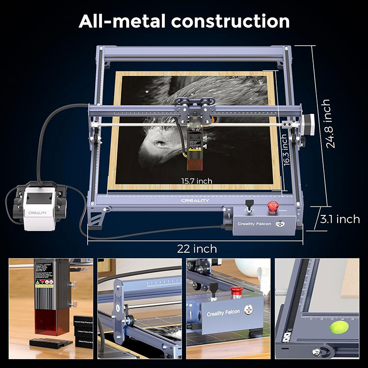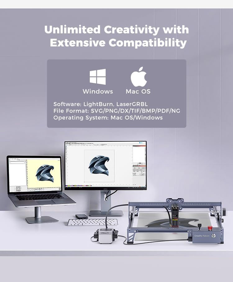 · 【ძლიერი და გამძლე თავსებადობის დეტალებით】სიზუსტე და გლუვი მოძრაობა უზრუნველყოფილია ანოდირებული ალუმინის შენადნობებით, L- ფორმის სილიკონის საფეხურებით და 8 მმ ფოლადის რელსით. ჩაშენებული ნიველერი თავიდან აიცილებს ცურვას და კალიბრირებულია იმის დასადგენად, არის თუ არა ლაზერული გრავირების მოწყობილობა სწორად განლაგებული. პაკეტის მიღების შემდეგ ის თავად უნდა დააინსტალიროთ; დასრულებას დაახლოებით 10 წუთი სჭირდება. Creality falcon ლაზერული გრავიორი თავსებადია გრავირების მრავალფეროვან პროგრამებთან, მათ შორის LightBurn გამოცდილი ლაზერული მომხმარებლისთვის და LaserGRBL ახალი ლაზერული მომხმარებლისთვის.
