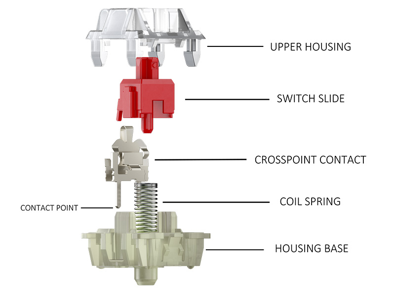 ხაზოვანი კონცენტრატორების დიზაინი მიზნად ისახავს წინააღმდეგობის ჩარევის შემცირებას. სტრუქტურული განსხვავება ხაზოვან და ტაქტიკურ კონცენტრატორებს შორის ვლინდება მათი მოქმედების მექანიზმებში: ხაზოვანი კონცენტრატორები იყენებენ გლუვი ღეროვანი სახელმძღვანელოს რელსებსა და პირდაპირ ცილინდრულ წყლებს, რომელთაც არ აქვთ მუწუკები და ნაბიჯები ღეროვანი ბაზაზე. როდესაც დაჭერით, ღეროვანი წრფივით ეშვება, ხოლო გაზაფხულის წინააღმდეგობა ერთნაირად იზრდება. ამის საპირისპიროდ, ტაქტიკური კონცენტრატორები ქმნიან მკვეთრ ტაქტიკურ ცვლილებებს მექანიკური სტრუქტურების საშუალებით. ლურჯი კონცენტრატორები იყენებენ კოჭის გაზაფხულზე და ჯვარედინი წერტილის კონტაქტს, რომელიც ათავისუფლებს კინეტიკურ ენერგიას შუა ნაწილზე, აწარმოებს ორეტაპიან "დაჭერით", გამოხატული ტაქტიკური უკუკავშირით და ხმის საშუალებით. ეს სტრუქტურული განსხვავებები პირდაპირ განსაზღვრავს მათ ტაქტილურ პროფილებს: ხაზოვანი კონცენტრატორები გთავაზობთ სიგლუვეს წინააღმდეგობის მოსახვევებით, ხოლო ტაქტიკური კონცენტრატორები განზრახ ქმნიან დადგმულ უკუკავშირს უფრო ინტერაქტიული აკრეფის რიტმისთვის.
