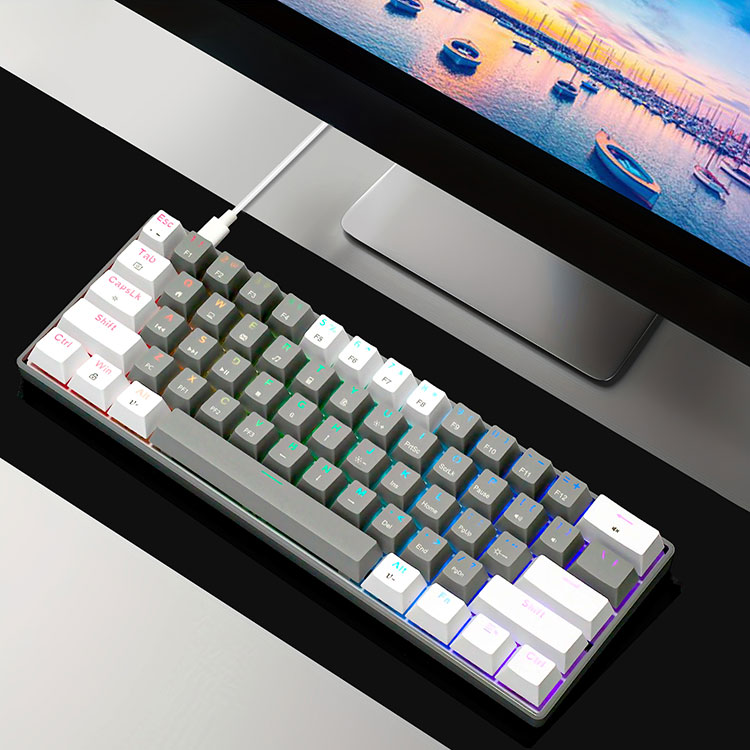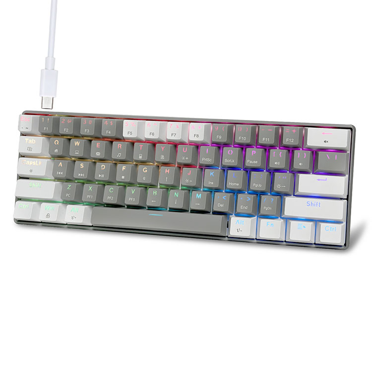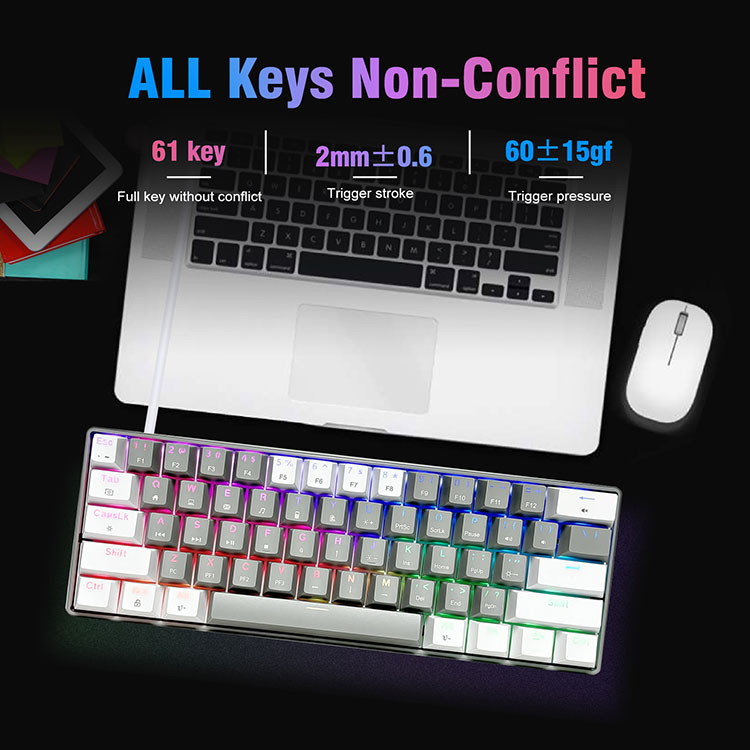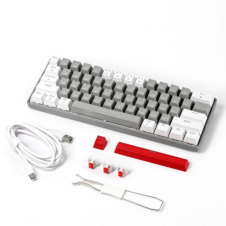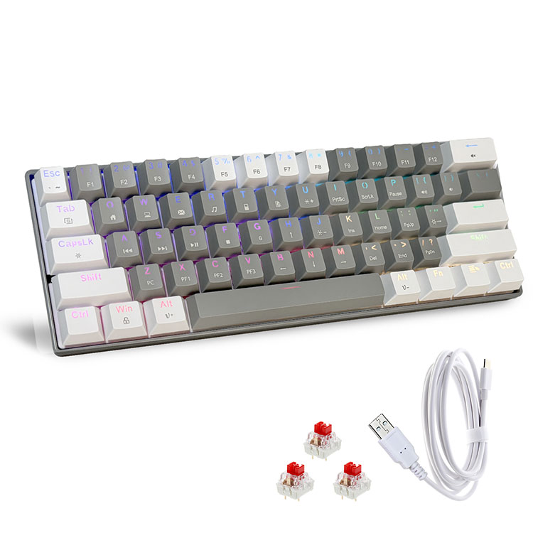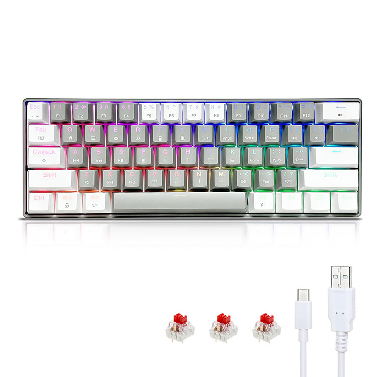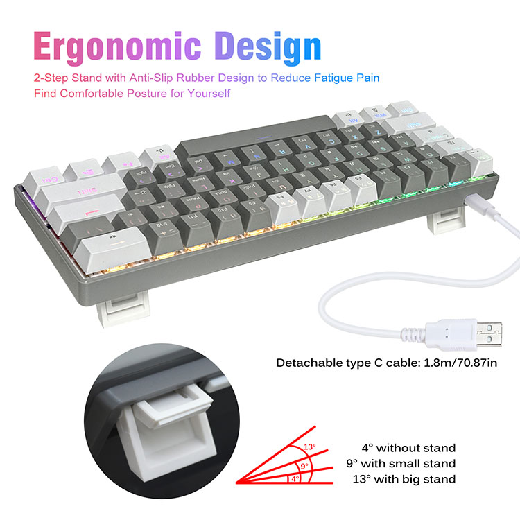 · სრული ანტი-აჩრდილის და ერგონომიული61-ვე ღილაკი არ არის კონფლიქტი, თეთრი ნაცრისფერი ბადაგის დიზაინი, ერგონომიული საკიდი ორმაგი ფერის საინექციო კლავიატურა, ორმაგი სადგამის ფეხის რეგულირებადი აკრეფის კუთხე და მოხსნადი USB კაბელი, როგორც პრაქტიკული, ასევე ლამაზი.