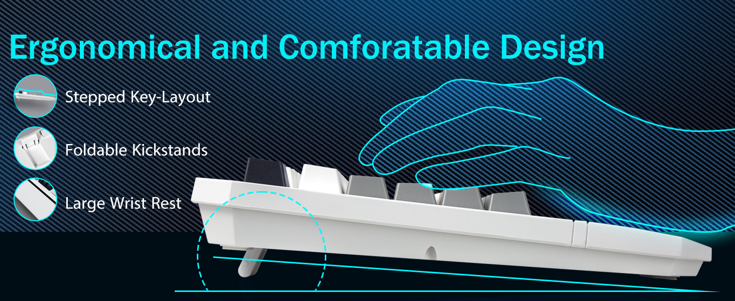 【მოწინავე ერგონომიკა მთელი დღის კომფორტისთვის】შექმნილია თქვენი კომფორტის გათვალისწინებით, ჩვენი კომპიუტერის მოთამაშის კლავიატურა აღჭურვილია სამეცნიერო კიბეებით - კლავიშის განლაგება და ფართო მაჯის საყრდენი. ეს კონფიგურაცია ინარჩუნებს თქვენს ხელებს ბუნებრივ მდგომარეობაში, ამცირებს ხელების დაღლილობას ხანგრძლივი გამოყენებისას. სადენიანი კლავიატურა ასევე აღჭურვილია 2 მტკიცე, დასაკეცი უკანა სადგამით, რაც საშუალებას გაძლევთ დაარეგულიროთ დახრილობა ოპტიმალური პოზისთვის.