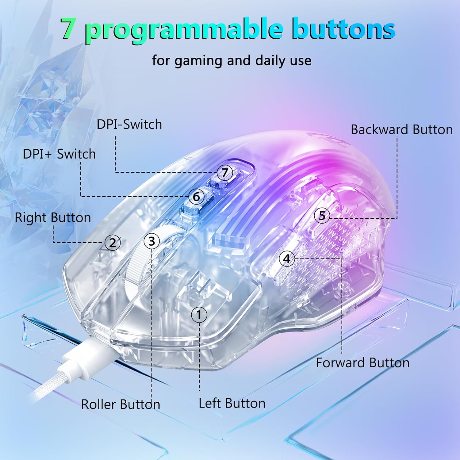 CHUANGQUAN თეთრი M695CT 24,000 DPI 8 RGB LED განათების რეჟიმი სადენიანი სათამაშო მაუსი უზრუნველყოფს ულტრა ზუსტი თვალყურის დევნებას, გლუვ კონტროლს და დინამიურ განათებას, შექმნილია მოთამაშეებისთვის, რომლებიც ითხოვენ სიჩქარეს, სიზუსტეს და სტილს.